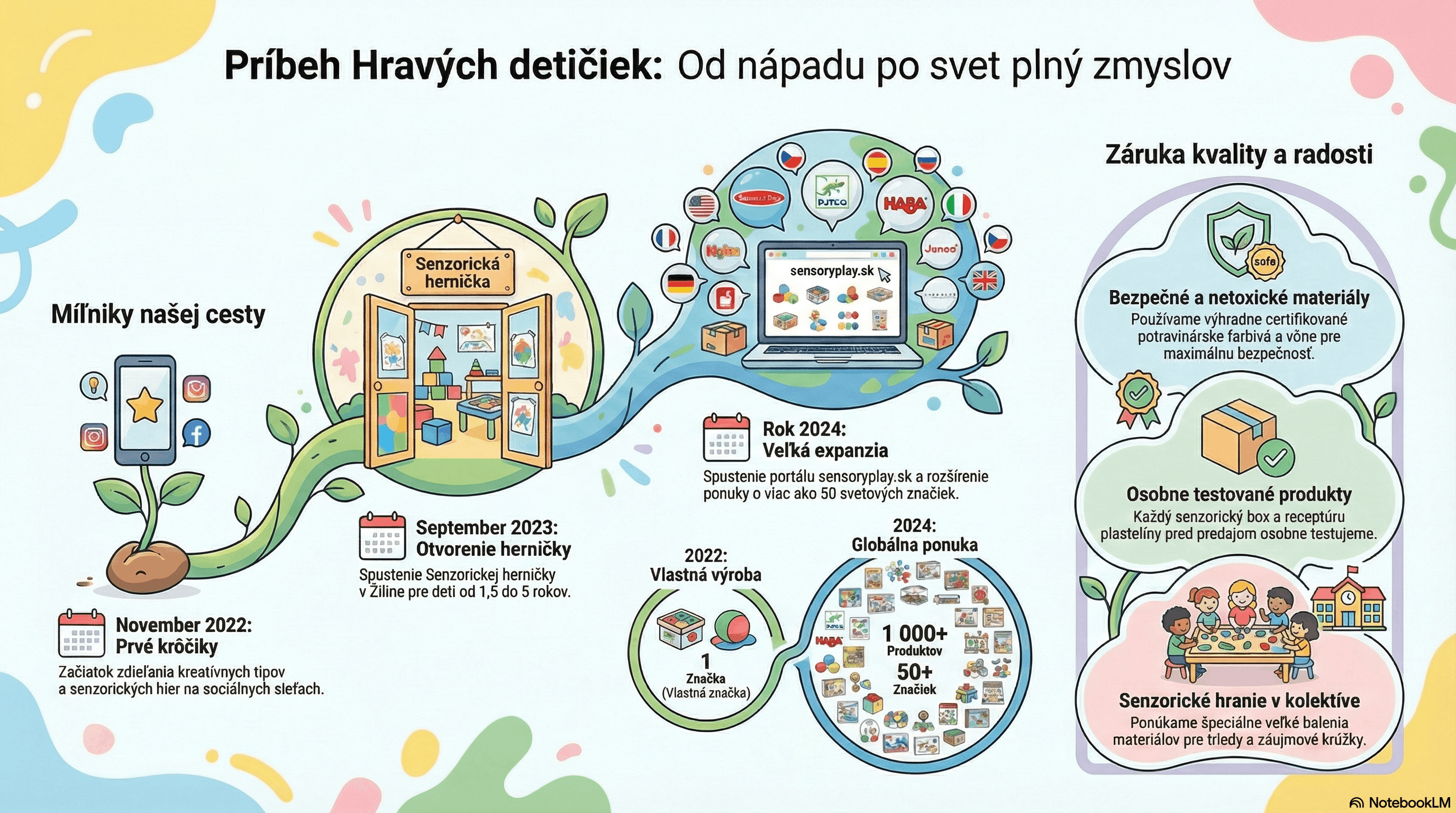 Hravé detičky vznikli z jedného jednoduchého presvedčenia: hra je pre dieťa tou najlepšou školou. Príbeh začal v novembri 2022, keď sme na Facebooku a Instagrame začali zdieľať tipy na kreatívne aktivity a senzorické hry pre najmenších. Ohlas bol okamžitý a náš zápal rástol spolu s komunitou rodičov, ktorí hľadali niečo viac než len bežné hračky.